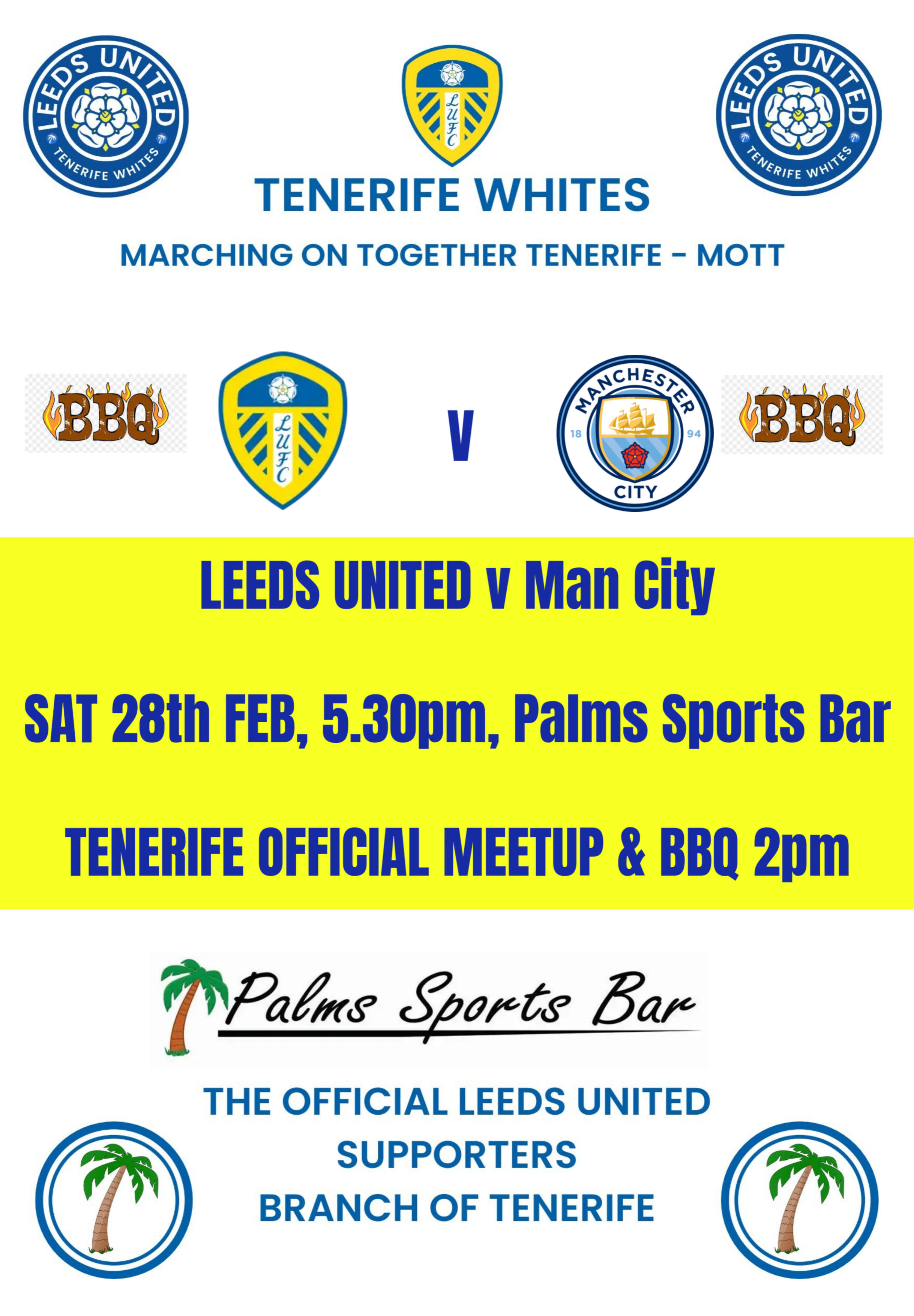 The Palms Sports Bar as mentioned in match day LEEDS FOOTBALL CLUB PROGRAMME. The only OFFICIAL SUPPORTERS BAR in TENERIFE endorsed by LEEDS UNITED FOOTBALL CLUB.TENERIFE WHITES - Marching on Together Tenerife MOTT
